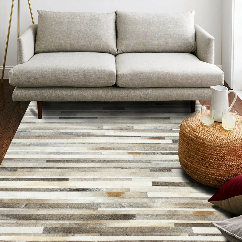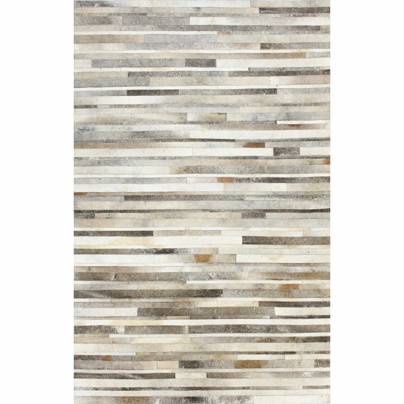 Update your home with traditional materials and a modern look thanks to this 5-by-8-foot Bashian Aldrich Cowhide Area Rug. Made from real cowhide, it features different skins in gray shades that are sewn together to create a patchwork of contemporary lines and shapes. A substantial, felt backing provides a layer of protection and cushioning, making this rug equally practical. Place it in your living room or bedroom for an eye-catching, statement piece.