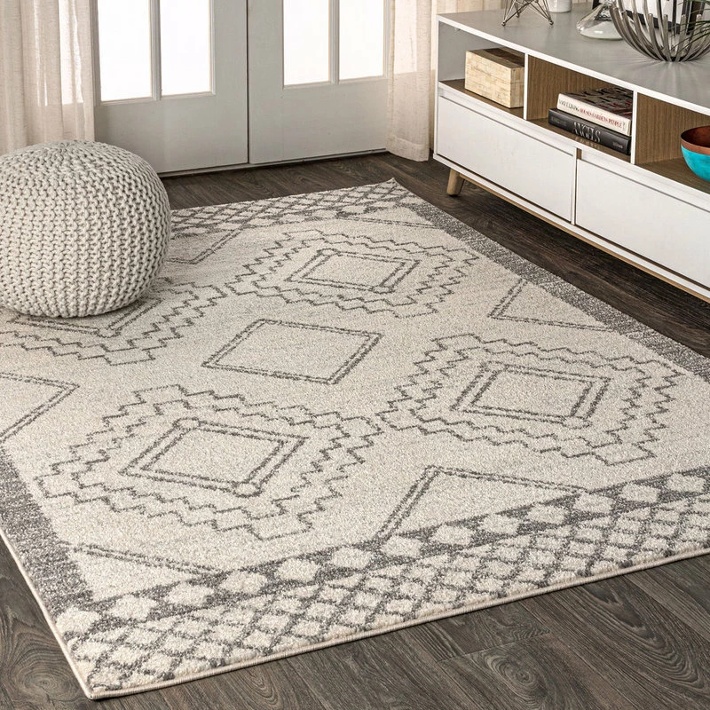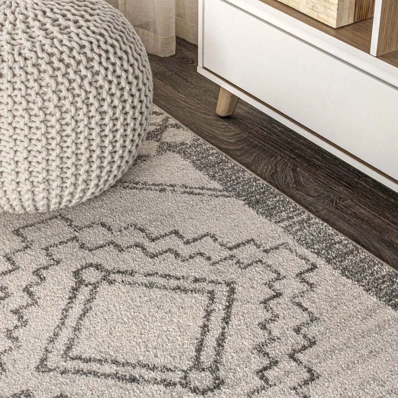 - The gray and ivory color scheme is a modern take on neutral, vintage Moroccan rugs