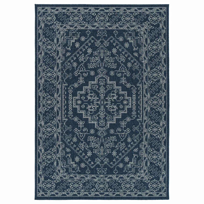 Intricate patterns from traditional designs become modern with trending color combinations in the Sunice collection. Choose from soft colors with subtle distressing or bolder palettes in crisp detail. These easy clean Indoor/Outdoor rugs are machine made in Egypt of 100% UV protected polypropylene, designed to liven up any space. Detailed colors in this rug are Navy,Ivory.