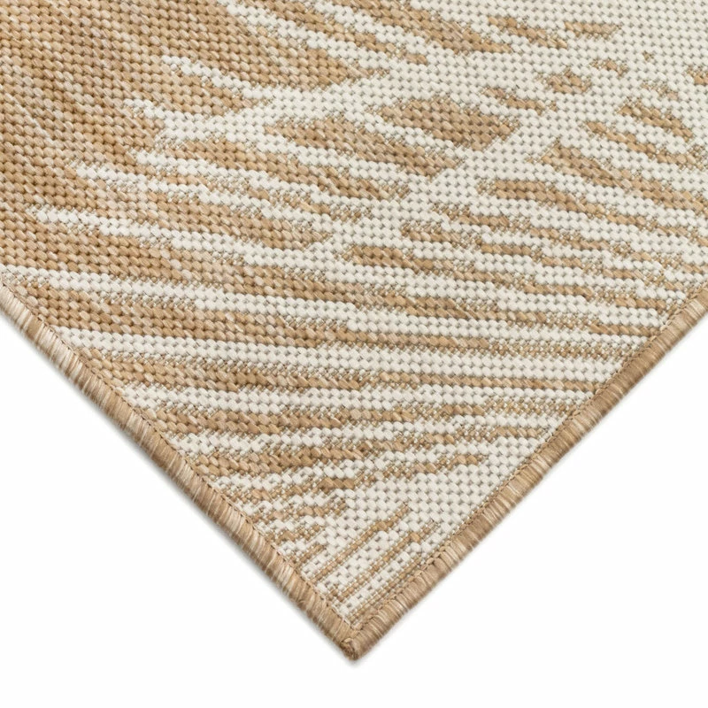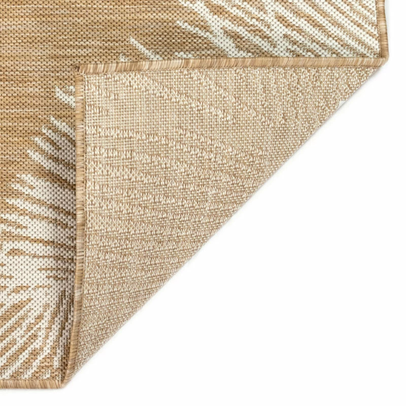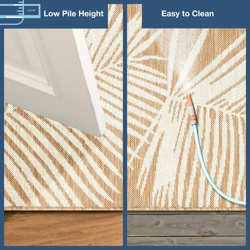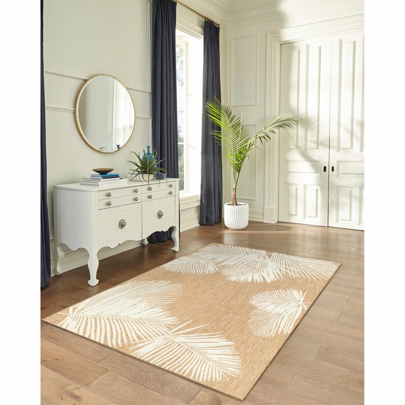 This flatweave area rug features a warm tan background accented by modern white palm leaves. A sophisticated take on tropical style, this design perfect for welcoming guests in your entryway, living room or as a stylish detail on your outdoor patio. Made in Turkey from 100% polypropylene, the Carmel Collection is Power Loomed to create subtle, naturally beautiful multi-toned detailed designs with a high-quality finish. The material is flatwoven, fade resistant, durable and ideal for those high traffic areas such as your patio and living room making this the perfect indoor or outdoor rug. A fresh take on traditional area rugs, patterns range from tropical, coastal, contemporary and classic to seamlessly tie together the design of your home. Limiting exposure to rain, moisture and direct sun will prolong rug life.