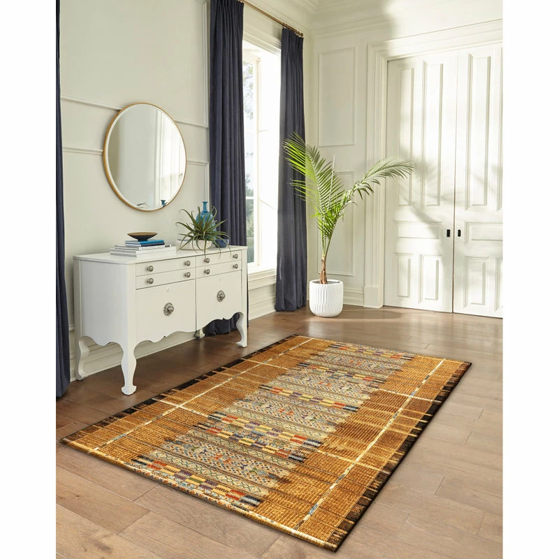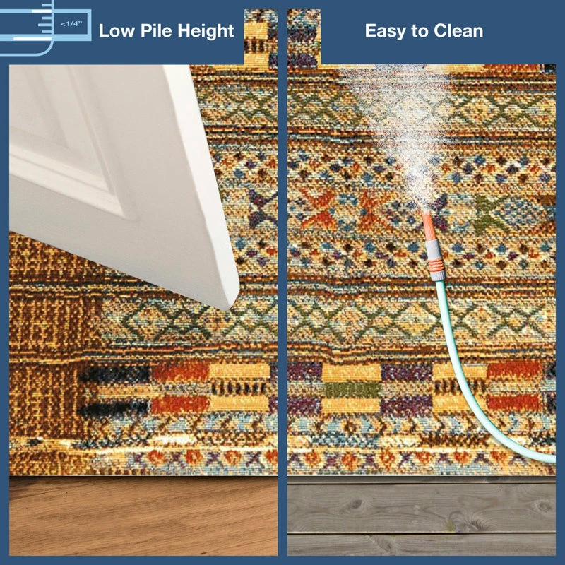 This area rug is inspired by traditional tribal designs that features linear patterns detailed with multiple colors and intricate shapes. The yellow gold background serves to highlight the vivid accent colors in yellow, red, purple and ivory to compliment its bold design, making this a truly unique piece for any space inside or outside your home.Made in Egypt from 100% polypropylene, the Marina Collection is Power Loomed to create intricate designs with a broad color spectrum and a high-quality finish. The material is flatwoven, low profile, weather resistant, UV stabilized for enhanced fade resistance, durable and ideal for those high traffic areas such as your patio, sunroom, kitchen, entryway, hallway, living room and bedroom making this the ideal indoor or outdoor rug. Detailed patterns are offered in an eclectic mix of styles ranging from tropical, coastal, geometric, contemporary and traditional designs; making these perfect accent rugs for your home. Limiting exposure to rain, moisture and direct sun will prolong rug life.