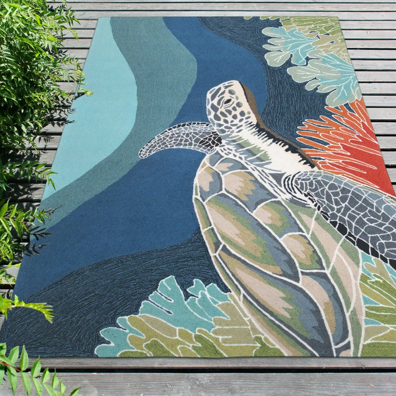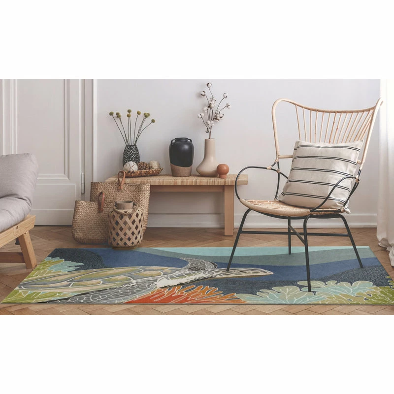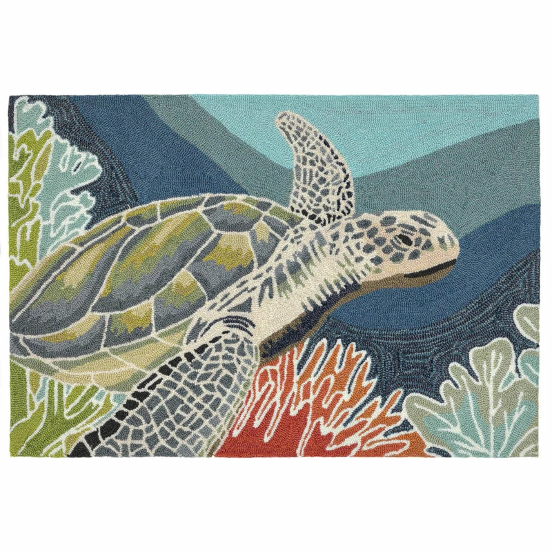 This hand-hooked area rug is one of our most popular designs. A lifelike sea turtle swims peacefully underwater in this artistic rendition that will make a colorful impact on any indoor or outdoor space. Made in China from a polyester acrylic blend, the Ravella Collection is hand tufted to create vibrant multi-toned detailed designs with tight textural loops and a high quality finish. The material is flatwoven, weather resistant and treated for added fade resistance, making this area rug perfect for indoor or outdoor placement. This soft, durable area rug is ideal for your patio, sunroom or those high traffic areas such as your kitchen, living room, entryway or dining room. Intricately shaded yarns bring to life the nature inspired designs of this collection that will beautifully accent your home. Limiting exposure to rain, moisture and direct sun will prolong rug life.