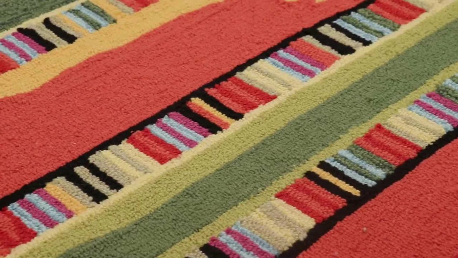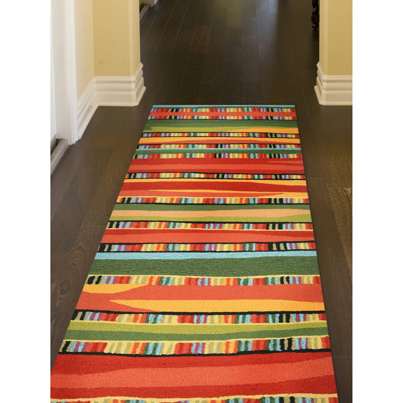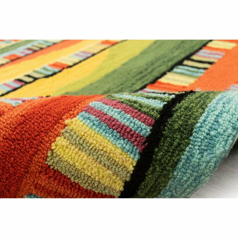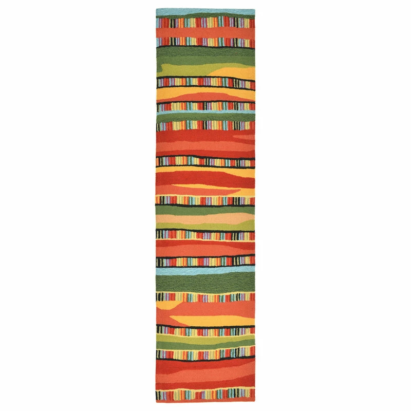 This hand-hooked area rug features overlapping stripe patterns that highlight intricate shading and vibrant red, green and yellow colors. This lively design with effortlessly compliment any indoor or outdoor space.Made in China from a polyester acrylic blend, the Ravella Collection is hand tufted to create vibrant multi-toned detailed designs with tight textural loops and a high quality finish. The material is flatwoven, weather resistant and treated for added fade resistance, making this area rug perfect for indoor or outdoor placement. This soft, durable area rug is ideal for your patio, sunroom or those high traffic areas such as your kitchen, living room, entryway or dining room. Intricately shaded yarns bring to life the nature inspired designs of this collection that will beautifully accent your home. Limiting exposure to rain, moisture and direct sun will prolong rug life.