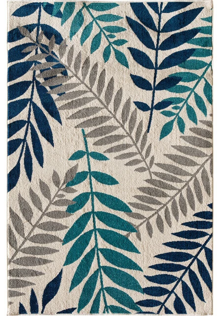Designed specifically for high-traffic areas, the Terrace Tropic Rug is machine woven from durable polypropylene. Measuring eight by 10 feet, it features a stylized terrace tropic design in a beige and blue palette. Use to add a decorative touch to a neutral lounge or living room.
