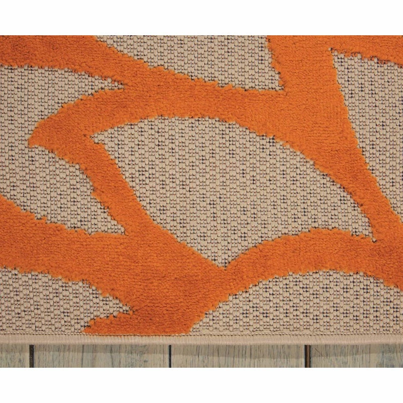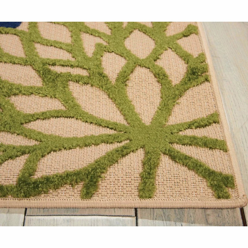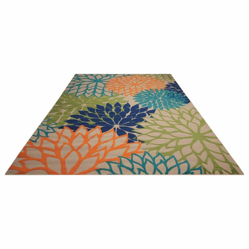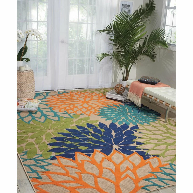 An oversized floral design in shades of blue, orange, green, navy and camel adds a high-spirited surge of style to any area. Featuring an ingenious polypropylene- fabrication thats a breeze to maintain and feels simply terrific underfoot, this uplifting indoor/outdoor rug is as sensible as it is sensational.