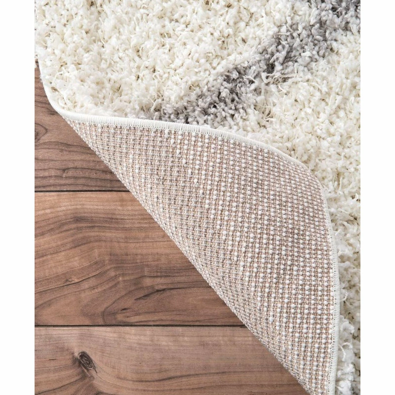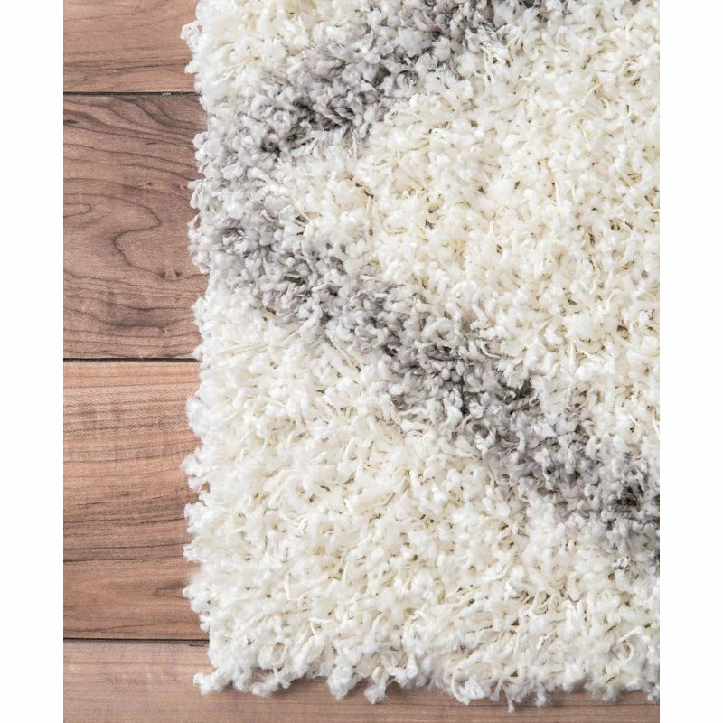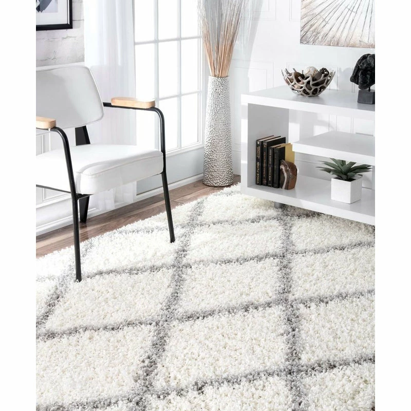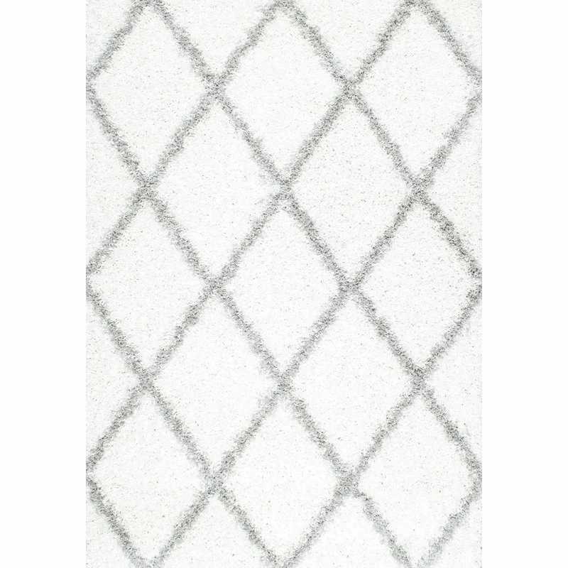 Machine woven from durable polypropylene, the Soft Rug features a white and gray trellis design. Measuring five by eight feet, it has fluffy shag that feel soft and cozy underfoot. Place in a contemporary space for a simple decorative touch.